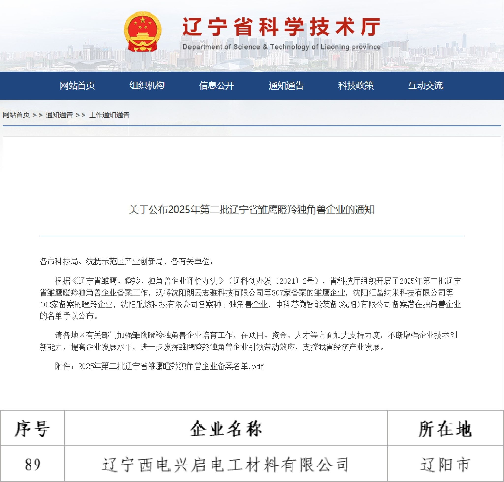 近日,辽宁省科学技术厅正式公布了2025年第二批雏鹰瞪羚独角兽企业备案名单,其中西电兴启荣登榜单,获得2025年第二批辽宁省“瞪羚企业”。
